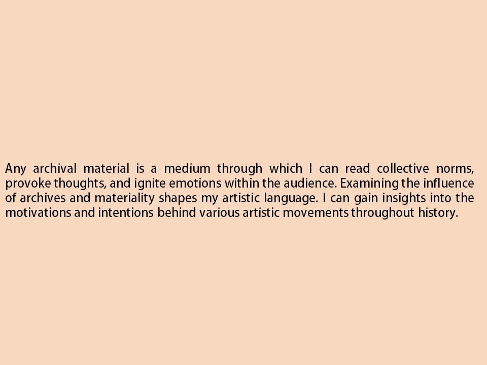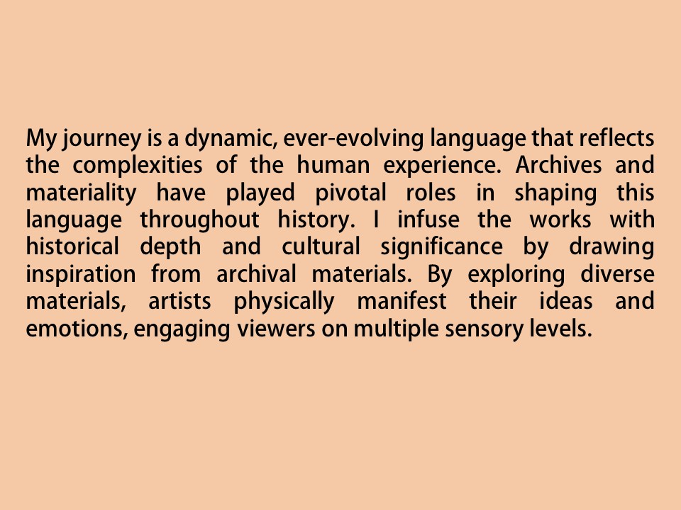 My journey is a dynamic, ever-evolving language that reflects the complexities of the human experience. Archives and materiality have played pivotal roles in shaping this language throughout history. I infuse the works with historical depth and cultural significance by drawing inspiration from archival materials.